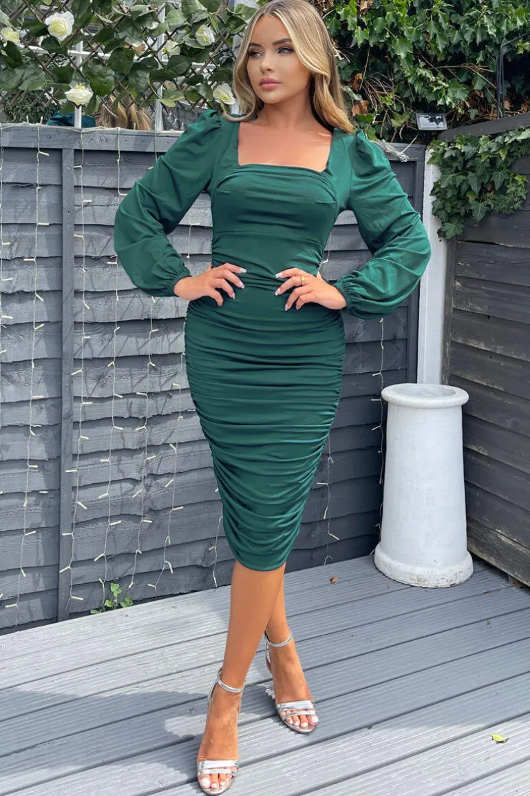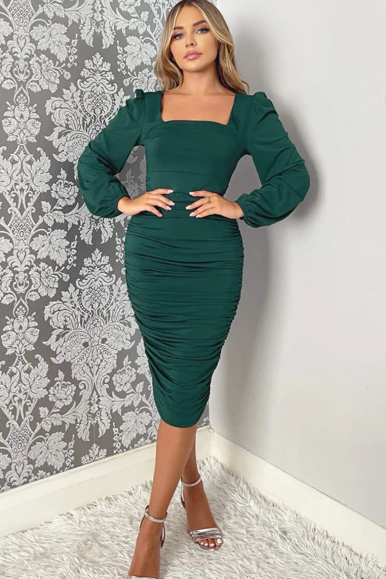 This Teal Square Neck Ruched Long Sleeve Midi Dress is the perfect