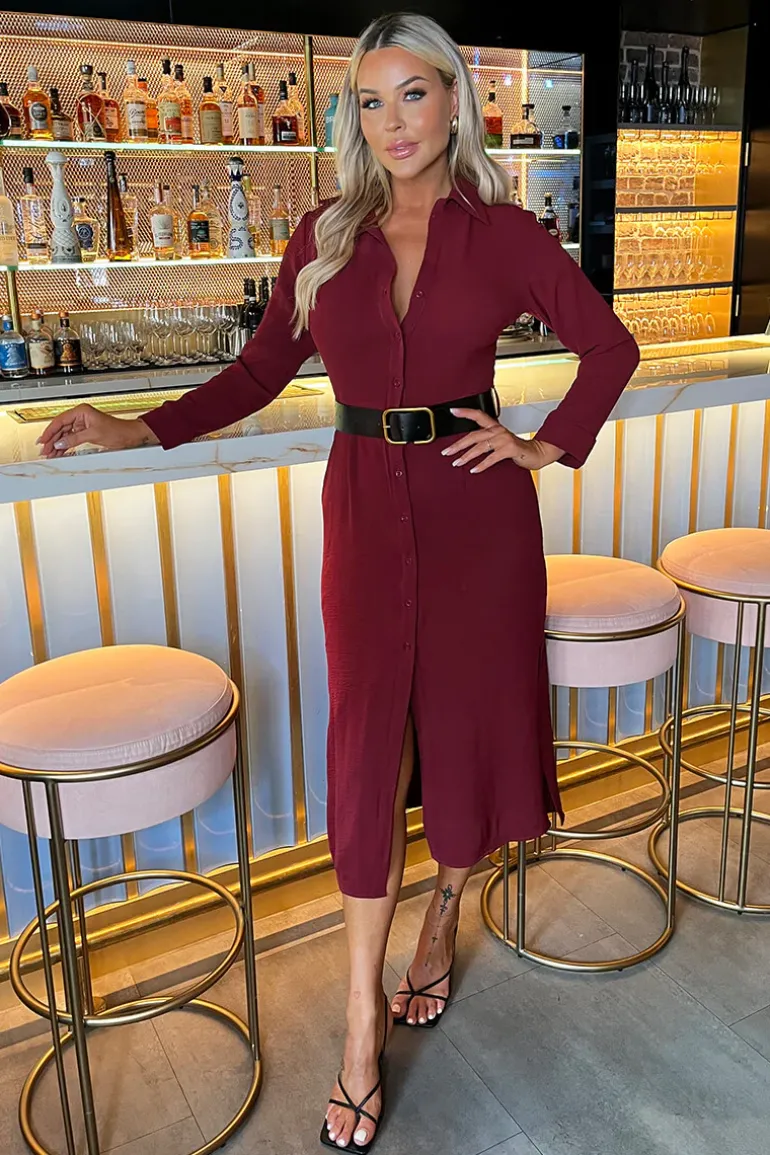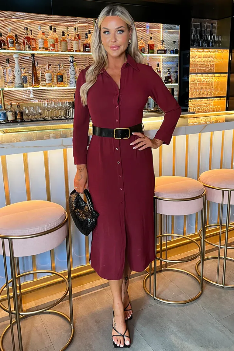 This Wine Button Front Belted Shirt Midi Dress is an easy to style