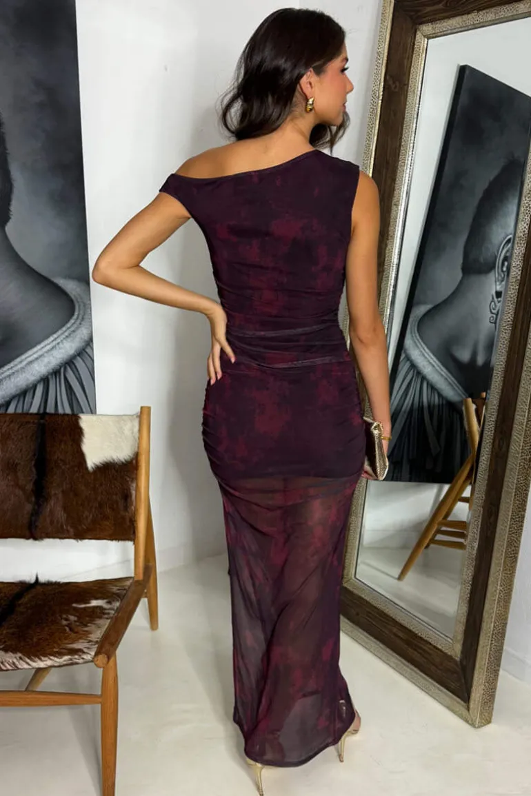 Be party-ready in our Wine And Black Printed Mesh Off The Shoulder