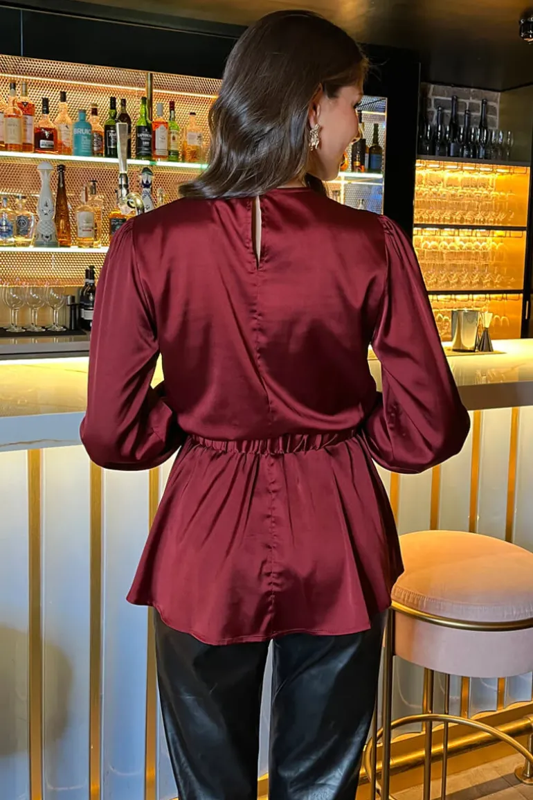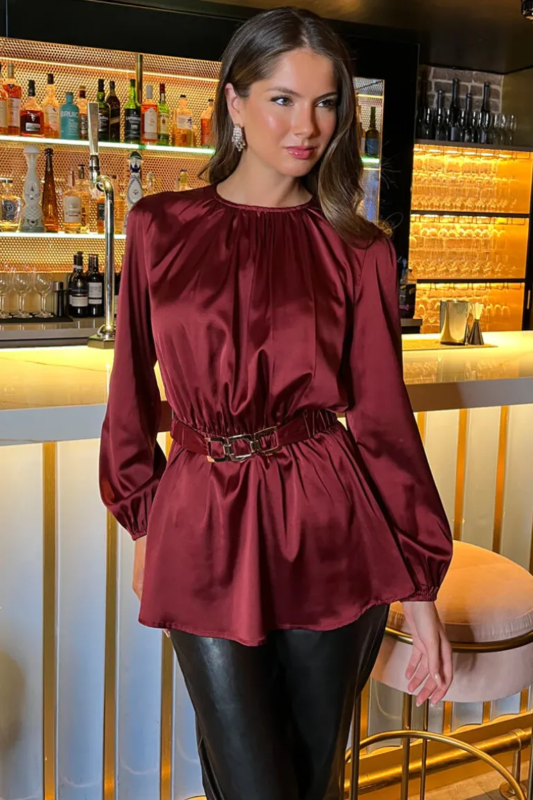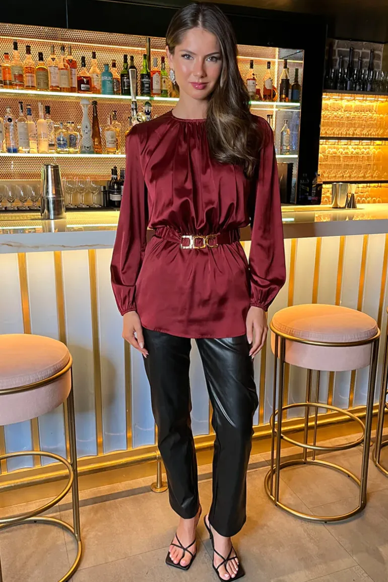 Our flattering Wine Satin Long Sleeve Gold Detail Belt Top will see