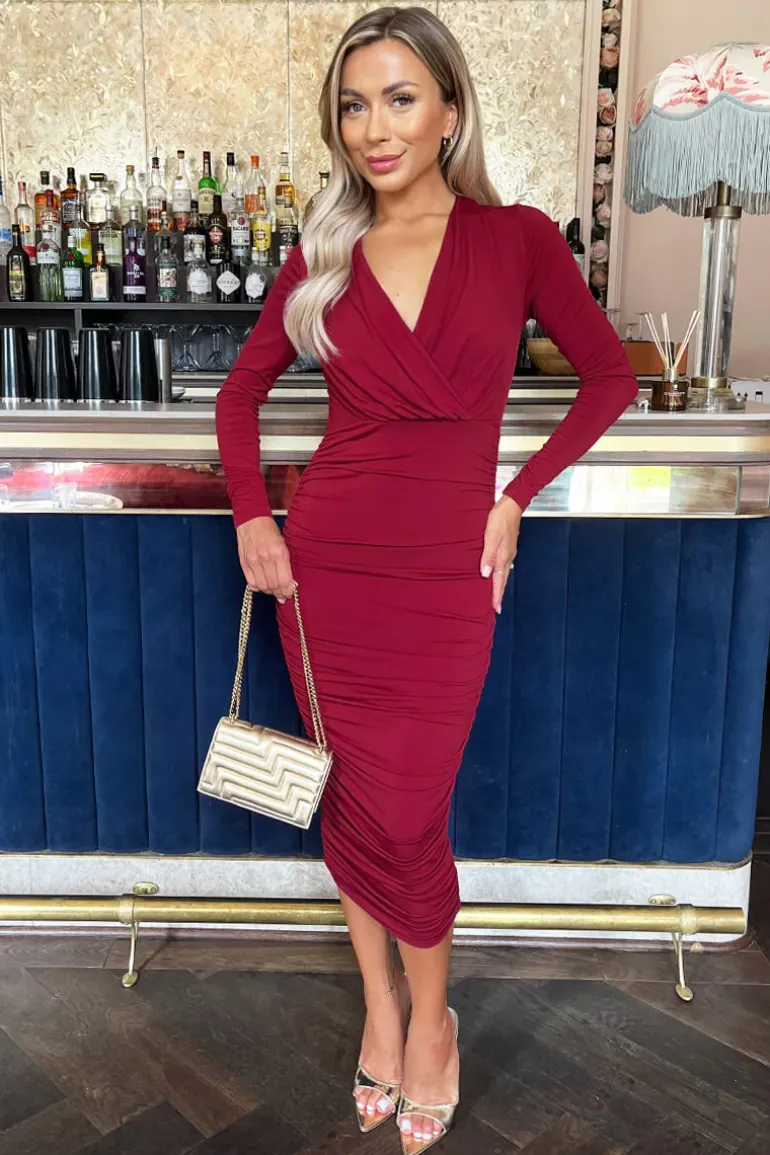 Classy and timeless, our Wine Wrap Top Long Sleeve Ruched Bodycon